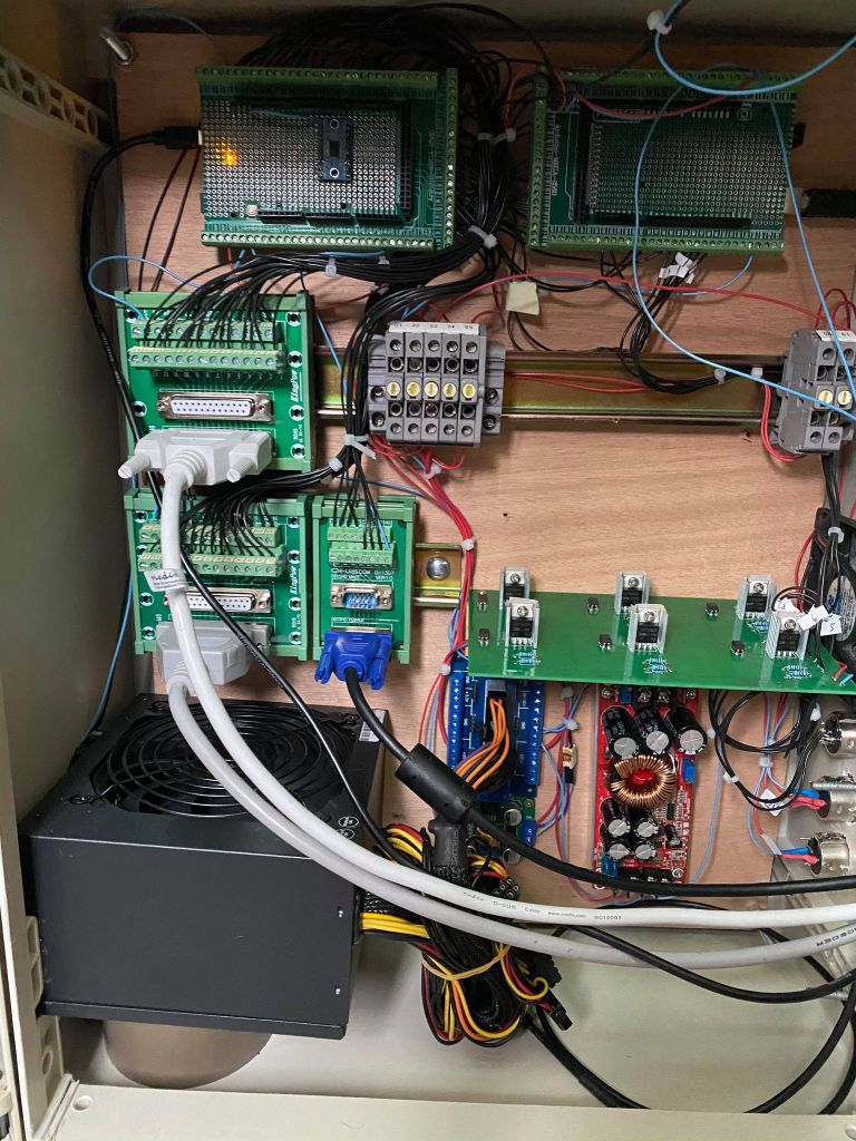 Il s’agit de ce que le conducteur du train a réellement entre les mains : une table avec différentes commandes pour conduire son train. Deux possibilités sont envisageables : soit utiliser des pièces de récupération, dans l’idéal un pupitre complet démonté d’une machine, soit reproduire soi même un tel pupitre. Dans le premier cas, il s’agit simplement de vider le pupitre de son câblage original. Celui-ci sera remplacé par un nouveau câblage. D’un autre côté, dans le cas du premier simulateur FerroviSim, je n’avais pas à ma disposition de pupitre SNCF. J’ai donc réalisé une réplique en menuiserie, agrémentée de quelques pièces d’origine. Cette étape sera détaillée sur ce site. En terme de vocabulaire, le pupitre et tous les manipulateurs et boutons qui le composent, sont la partie physique du simulateur. On parle alors de hardware.