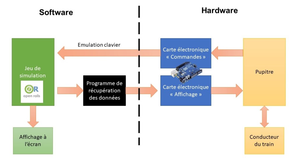 Toute la complexité du projet réside dans la réalisation de cet interfaçage. Il s’agit en effet de trouver une solution pour connecter le pupitre au jeu, sachant que le jeu n’est à priori pas fait pour. Mais comment faire ? Je vous disais que OpenRails se commande à l’origine comme un clavier : l’idée vient donc naturellement. Si notre pupitre « imite » le fonctionnement d’un clavier d’ordinateur, alors il sera possible de commander le jeu. On parle plus précisément d’émulation de clavier. En terme de solution technologique, certaines cartes électroniques programmables du commerce permettent cela. Reste à réaliser le retour d’information du jeu vers le pupitre (vitesse, pression…). Là c’est plus compliqué, mais plusieurs solutions existent, que je détaillerai par ailleurs. Toujours est il qu’il faudra intégrer à notre système un petit programme informatique qui gère cette fonction de retour d’information. On obtient donc la structure suivante pour notre système :