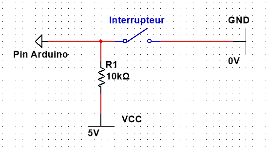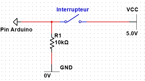 De cette façon, lorsque l’interrupteur est ouvert (comme sur l’image), le pin est « tiré » à la masse par la résistance de 10kOms. On détecte bien un niveau logique bas (0V).