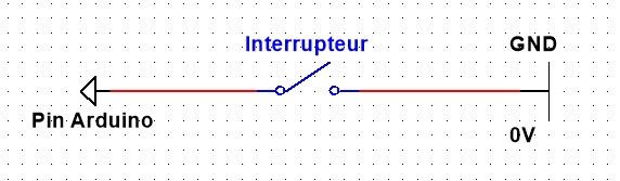 La réponse est simple : parce que Arduino sait faire ce montage pull-up pour vous ! Autrement-dit, chaque pin dispose d’une résistant de tirage à 5V qui peut être activée par une simple ligne de code ! Le montage à faire est donc le suivant :